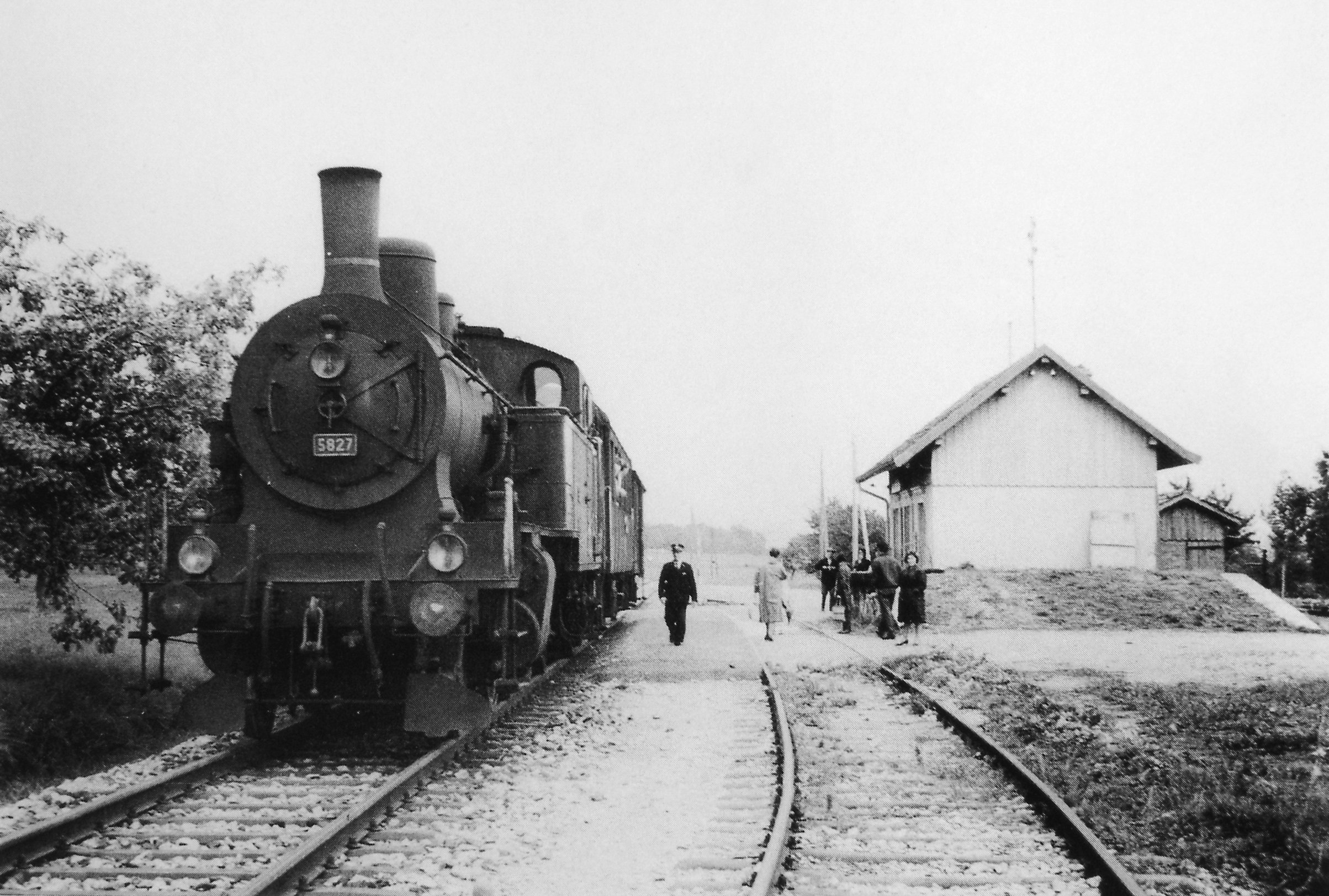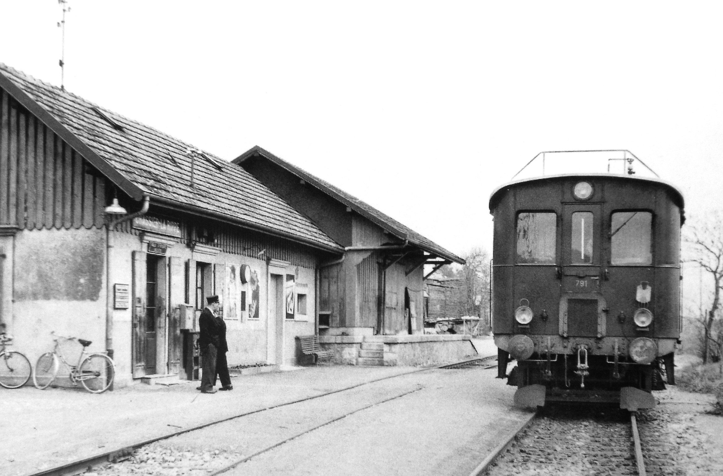 Daher sehen wir die Dampflokomotive Eb 3/5 «Habersack» und den Dieseltriebwagen BDm 2/4, früher BFm 2/4, 2. Klasse mit Gepäck- und Postabteil.