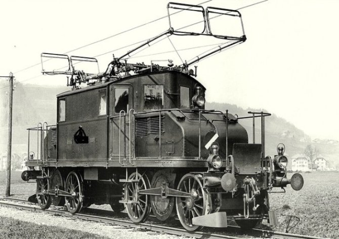 Allein schon die mächtigen und ungewohnten Stromabnehmer (Pantographen?) wecken das Interesse an dieser wuchtigen Machine aus der Frühzeit der Elektrolokomotiven.